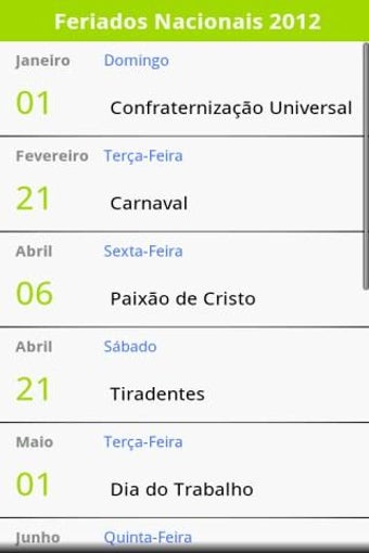 O Calendário de Feriados 2012 é bem simples. Basicamente é uma lista com os Feriados Nacionais do ano. O aplicativo é bastante útil, mas ficaram faltando os feriados municipais ou a opção de adicionar as datas festivas no calendário do Android.